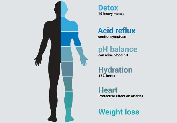 शरीर में क्षारीय पानी मौजूद अम्लीय विषाक्त पदार्थों को बेअसर कर देता है. इन विषाक्त पदार्थों की वजह से शरीर को हेल्दी रहने के लिए ओवर काम करना पड़ सकता है, जिसके परिणामस्वरूप सुस्ती और समग्र कमजोरी होती है. क्षारीय पानी, जो शरीर में आसानी से अवशोषित हो जाता है, शरीर से विषाक्त पदार्थों और हानिकारक पदार्थों को बाहर निकालने की में मदद कर सकता है. क्षारीय पानी को किसी की संचार प्रणाली के प्रदर्शन में सुधार करने के लिए भी जाना जाता है, जिसका अर्थ है कि रक्त की गुणवत्ता बेहतर होना और महत्वपूर्ण अंगों को अधिक ऑक्सीजन मिलना.